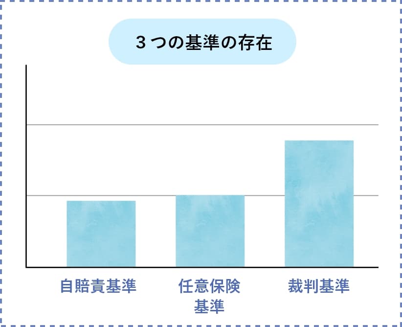 - 交通事故においては、自賠責保険の基準(自賠責基準)、任意保険会社の内部基準(任意保険基準)及び裁判所が賠償額算定で利用している基準(裁判基準)という3つの基準(右記図参照)が存在し、裁判基準が一番金額が高いとされています。